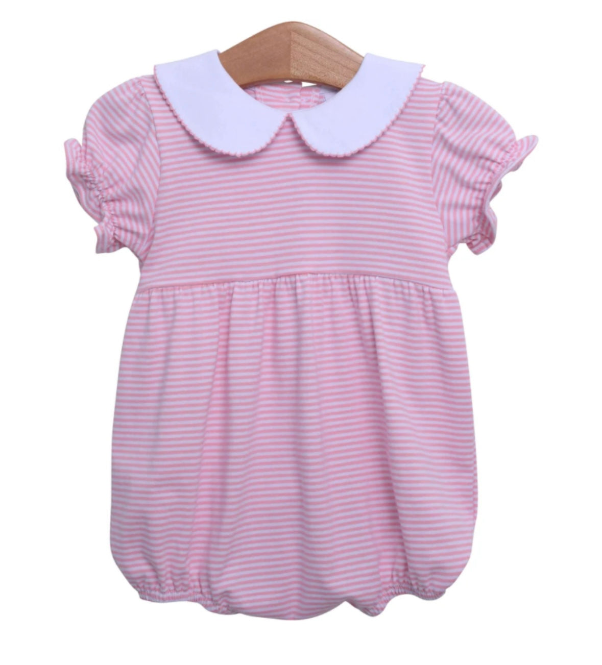 Embroidery takes up to 10 business days "Add a personal touch to your little one's wardrobe with our Pink Stripe Charlotte Romper. Customize with a name, monogram, or design to make it the perfect gift for any baby. It's sure to be a favorite in no time!