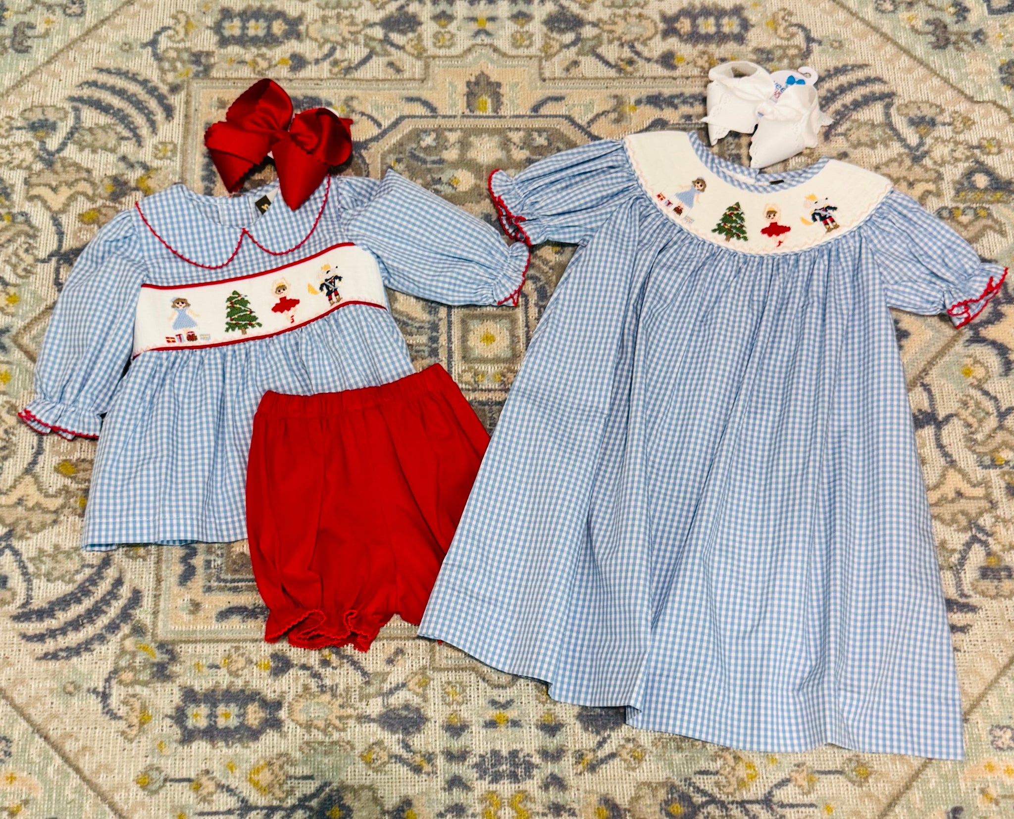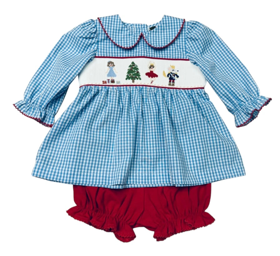 Crack open the holiday season with our Nutcracker Smocked Bloomer Set! This classic and timeless dress features charming nutcracker smocking details, making it a precious addition to your little one's wardrobe. Perfect for any festive occasion, this dress is sure to bring joy to all.