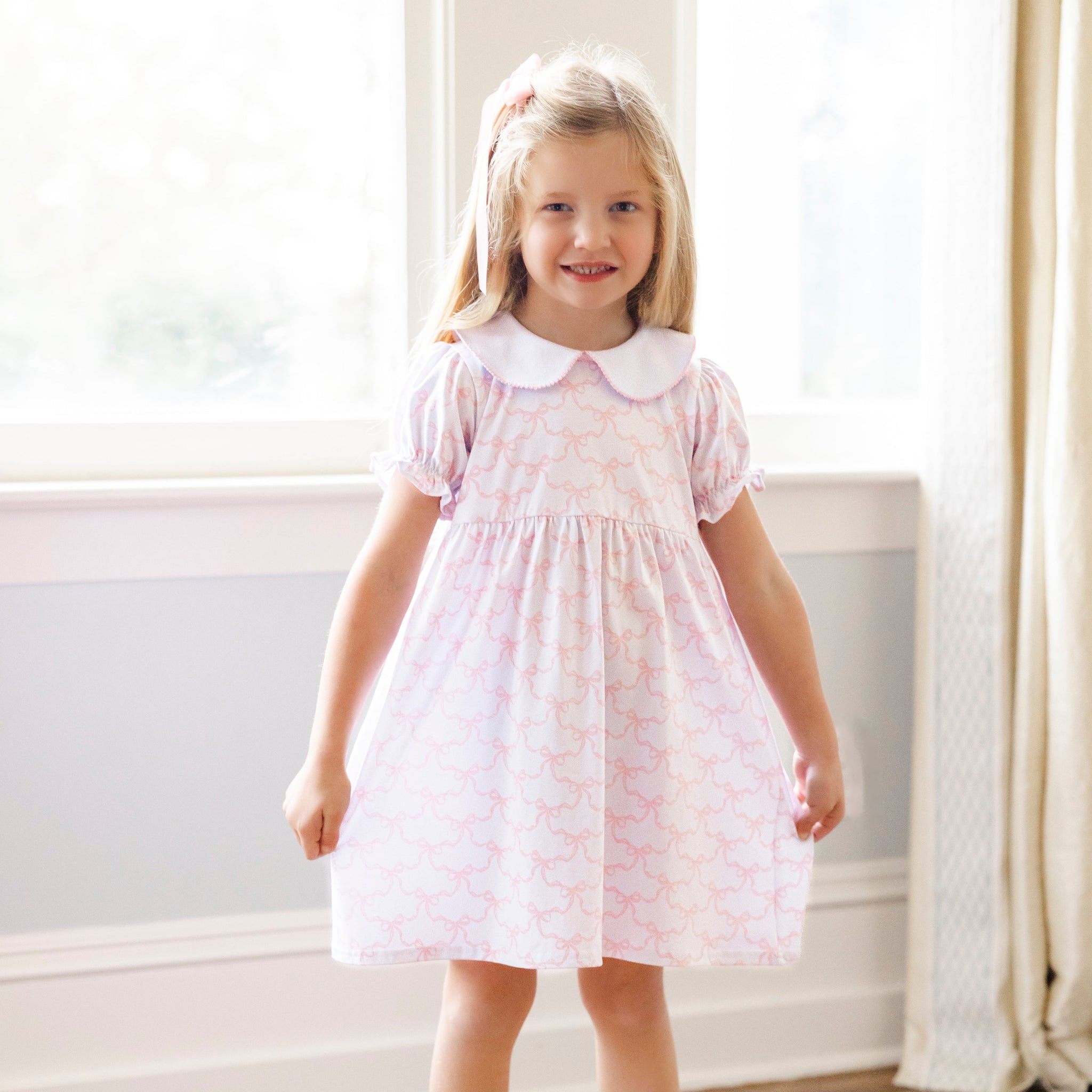 One of our best selling dress is now available in this adorable pink trellis bow print. The playful Peter pan collar adds a charming detail to this dress. Perfect for any occasion, this dress is sure to make you feel cute and carefree!