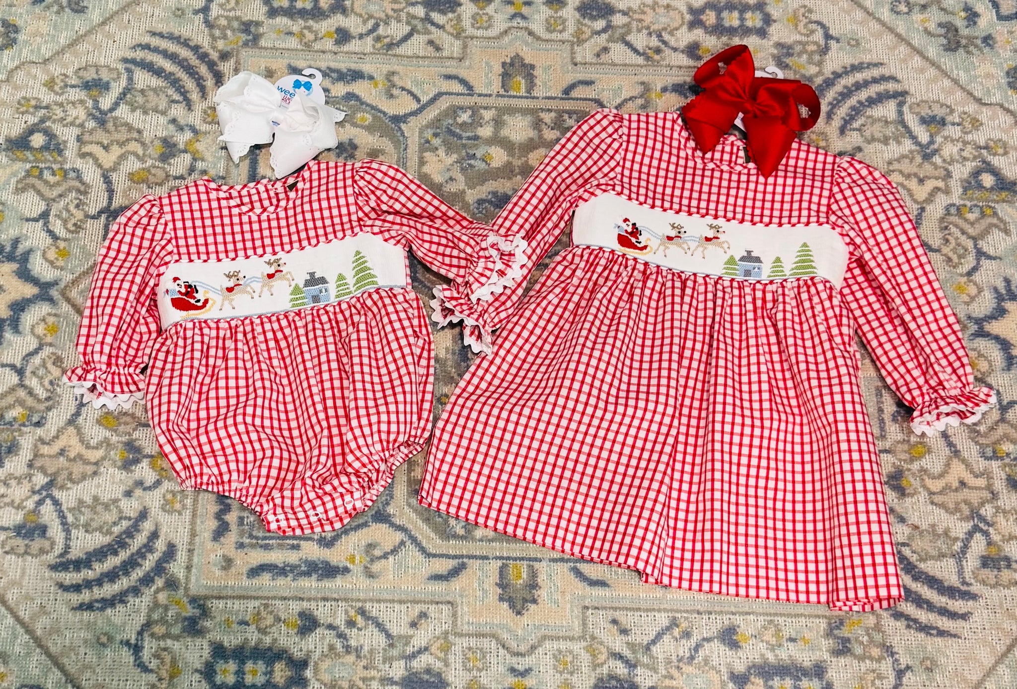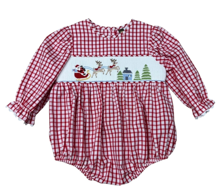Get ready for Santa's arrival with this adorable sibling set featuring a smocked design of Santa and his trusty sleigh!
