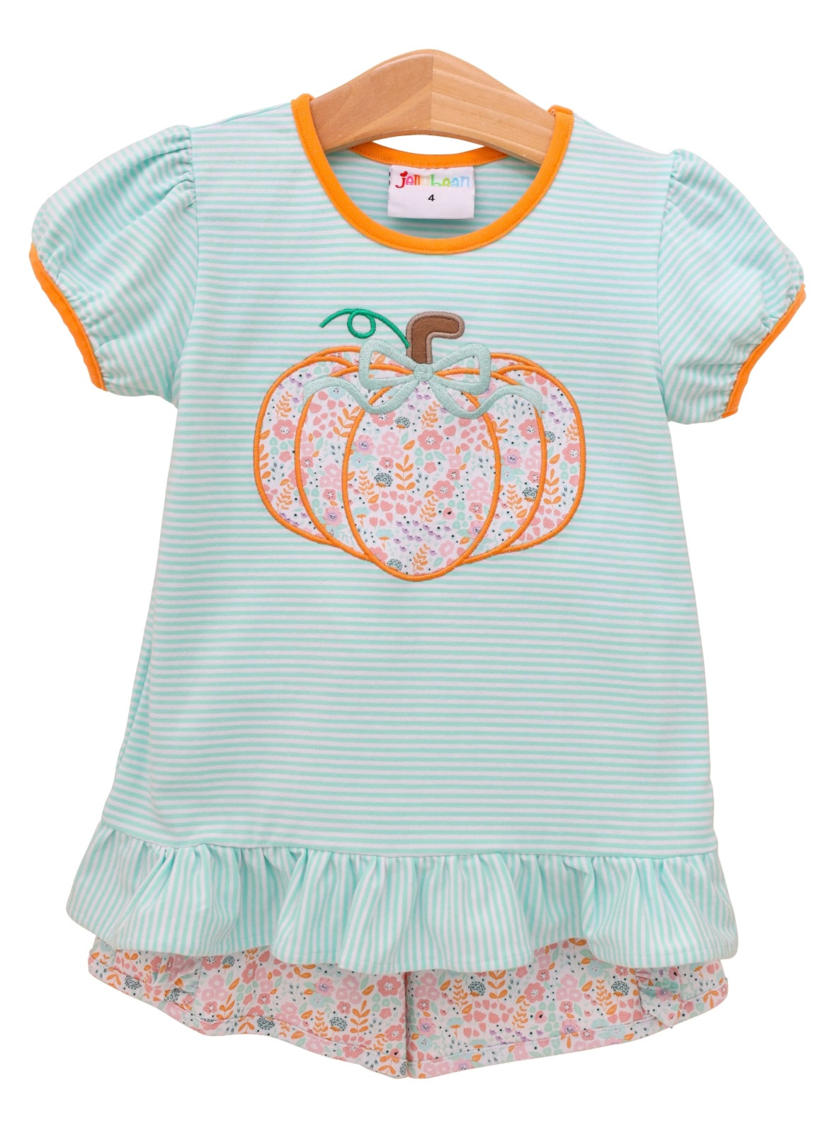 Celebrate fall in style with this playful Floral Print Pumpkin Ruffle Short Set
